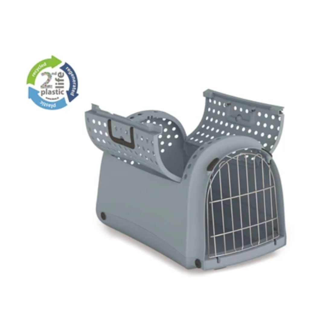 Imac Reismand Linus Cabrio 2nd Life Gerecycled Lichtblauw 50X32X34,5 cm is een moderne transportbox voor de hond of kat van sterk, gerecycled plastic, met veel ventilatie en ijzeren traliedeur.