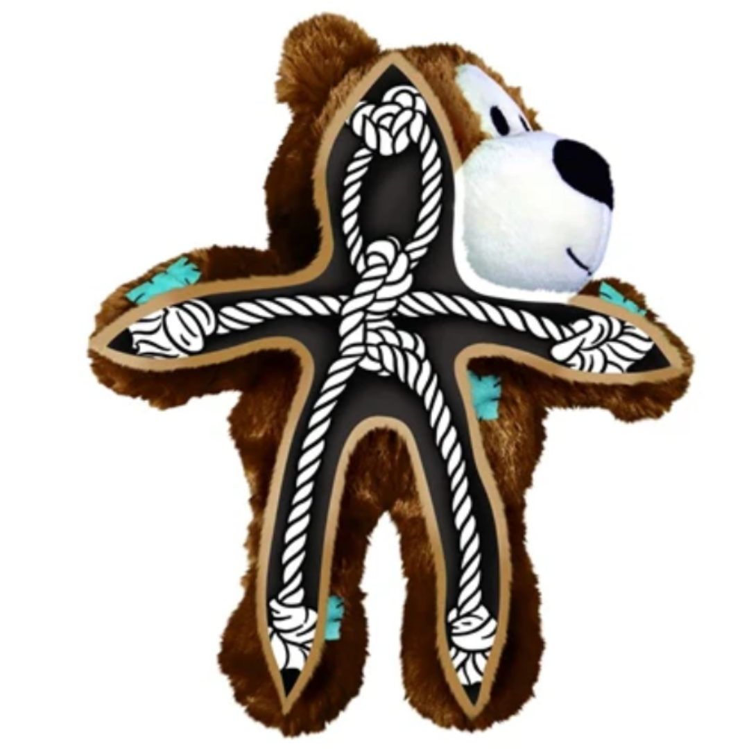 De Kong Wild Knots Bear Assorti is hondenspeelgoed met een pluche buitenkant en een sterk touwskelet, voorzien van verstevigde punten en diverse piepers. Knuffelbaar en sterk tegelijk, dat is deze leuke KONG Wild Knots Bear Assorti. De beer heeft een knuffelige, heerlijk zachte buitenkant van pluche met een schattig gezichtje en leuke details. De binnenkant is echter uitgevoerd met een stevig touwskelet, zodat er ook met de beer gestoeid, gespeeld en geschud kan worden. De beer is voorzien van versteviging op de belangrijkste punten voor nog meer duurzaamheid en een pieper om de hond nog meer tot spelen aan te zetten. Om troep te voorkomen en beter grip op het touw te creëren, is de beer uitgevoerd zonder vulling.