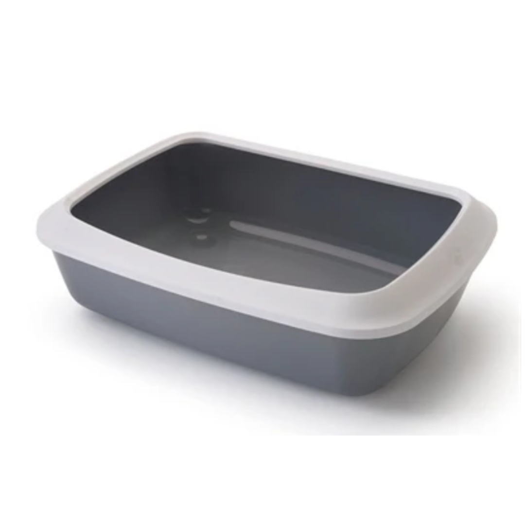 De Savic Kattenbak Iriz Met Rand Koudgrijs / Wit van is een moderne open kattenbak met verwijderbare rand en lage instap, ideaal voor katten die slecht ter been zijn en kittens. Een ideale bak voor volwassen katten, kittens, maar ook als konijnentoilet! Deze kattenbak bestaat uit een onderbak met een losse rand die het uitgooien van kattengrit helpt verminderen, een handige open kattenbak van stevig kunststof. De lage toegang zorgt ervoor dat de dieren de bak gemakkelijk in en uit kunnen, en de verwijderbare, losse rand maakt eenvoudig schoonmaken mogelijk.