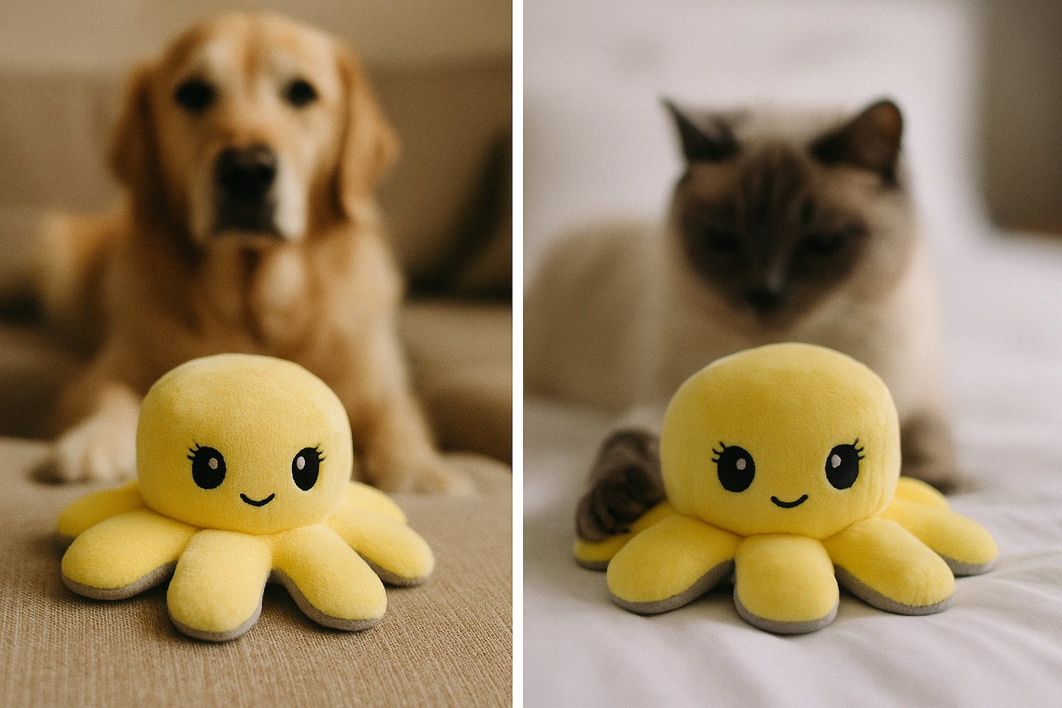 De Trixie Octopus Omkeerbaar Pluche Grijs/Geel 19 cm is een wendbare hondenknuffel in de vorm van een octopus, van zacht pluche en met geluid. Met deze leuke knuffel van Trixie biedt jij jouw hond twee figuurtjes in één! Deze octopus kan twee kanten op gedraaid worden, zodat je kunt kiezen uit twee kleuren en bijbehorende gezichtjes. De knuffel is gemaakt van zacht pluche en daardoor het perfecte knuffelmaatje, maar door de toevoeging van geluid ook perfect om lekker mee te spelen.
